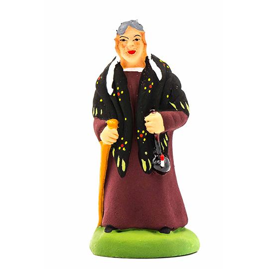femme âgée et courbee qui éclaire ses pas à 'aide d'une petite lampe à huile romaine le CALEN.